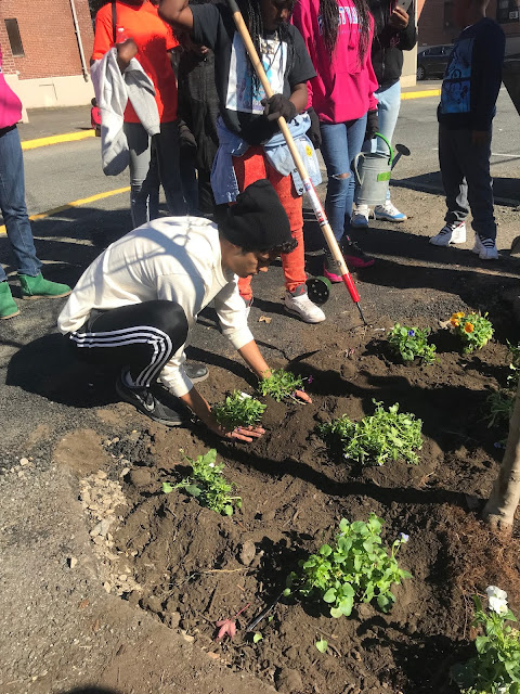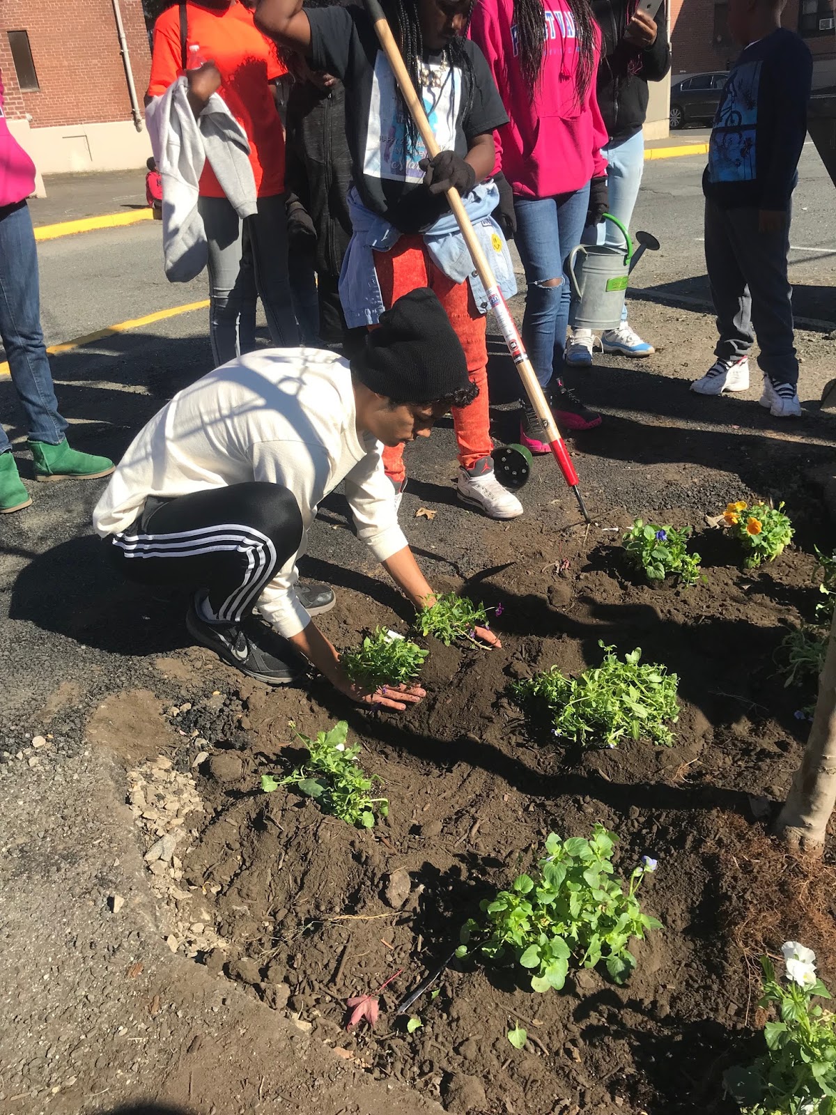 (October 28, 2017—Jersey City, NJ) High Tech Environmental Science major Jeremy Lewan of Bayonne and High Tech chemistry instructor William Goold joined in the Tree Planting and Maintenance Community Engagement Project, sponsored by the Jersey City Housing Authority, the Tree Lovers Crew, AARP, and several other organizations, announced Dr. Joseph Giammarella, principal of High Tech High School.